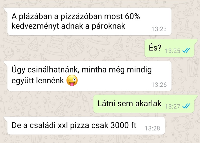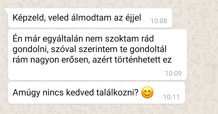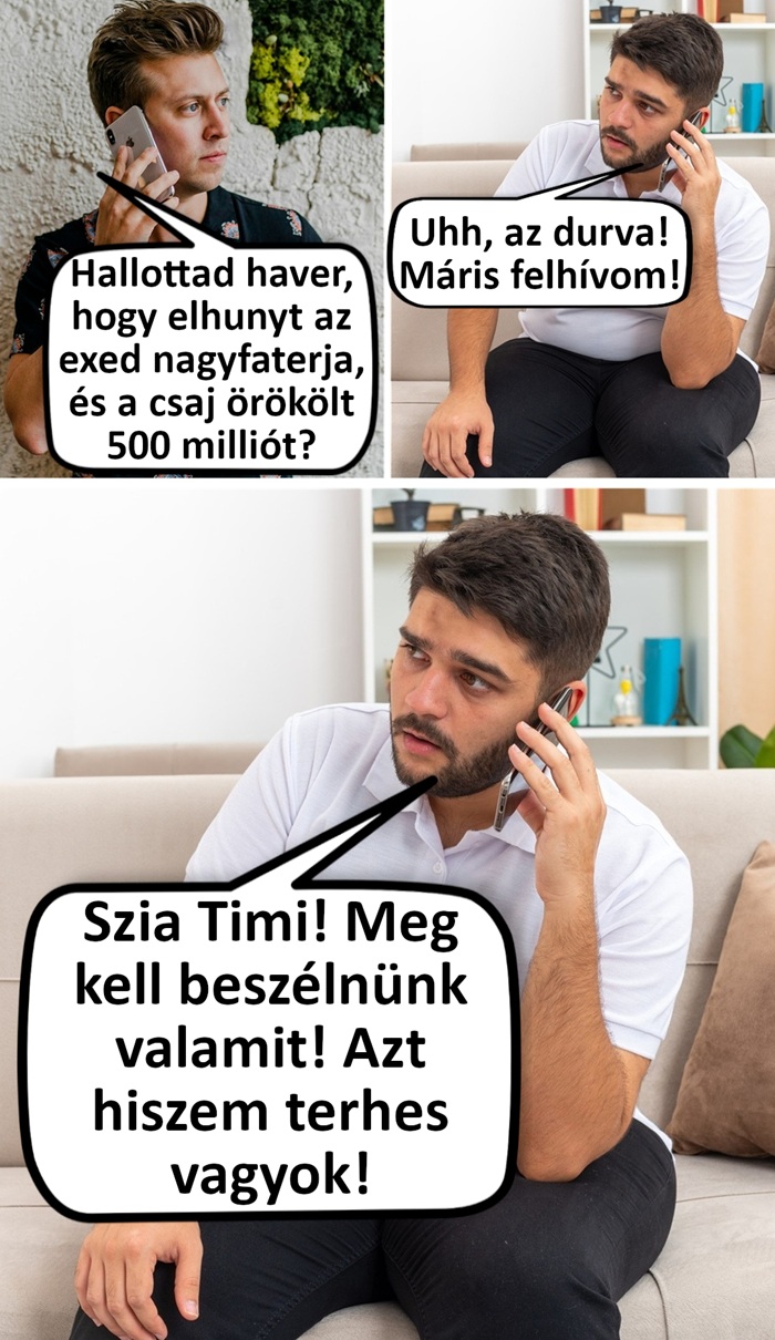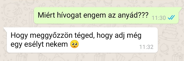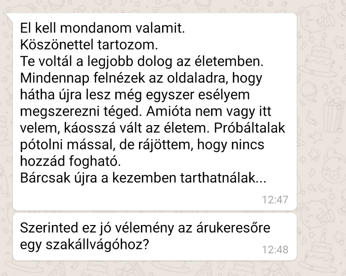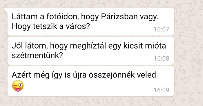 2. Valamiért halaszthatatlannak érezte, hogy megbeszéljen valamit az exével. (Velem.)