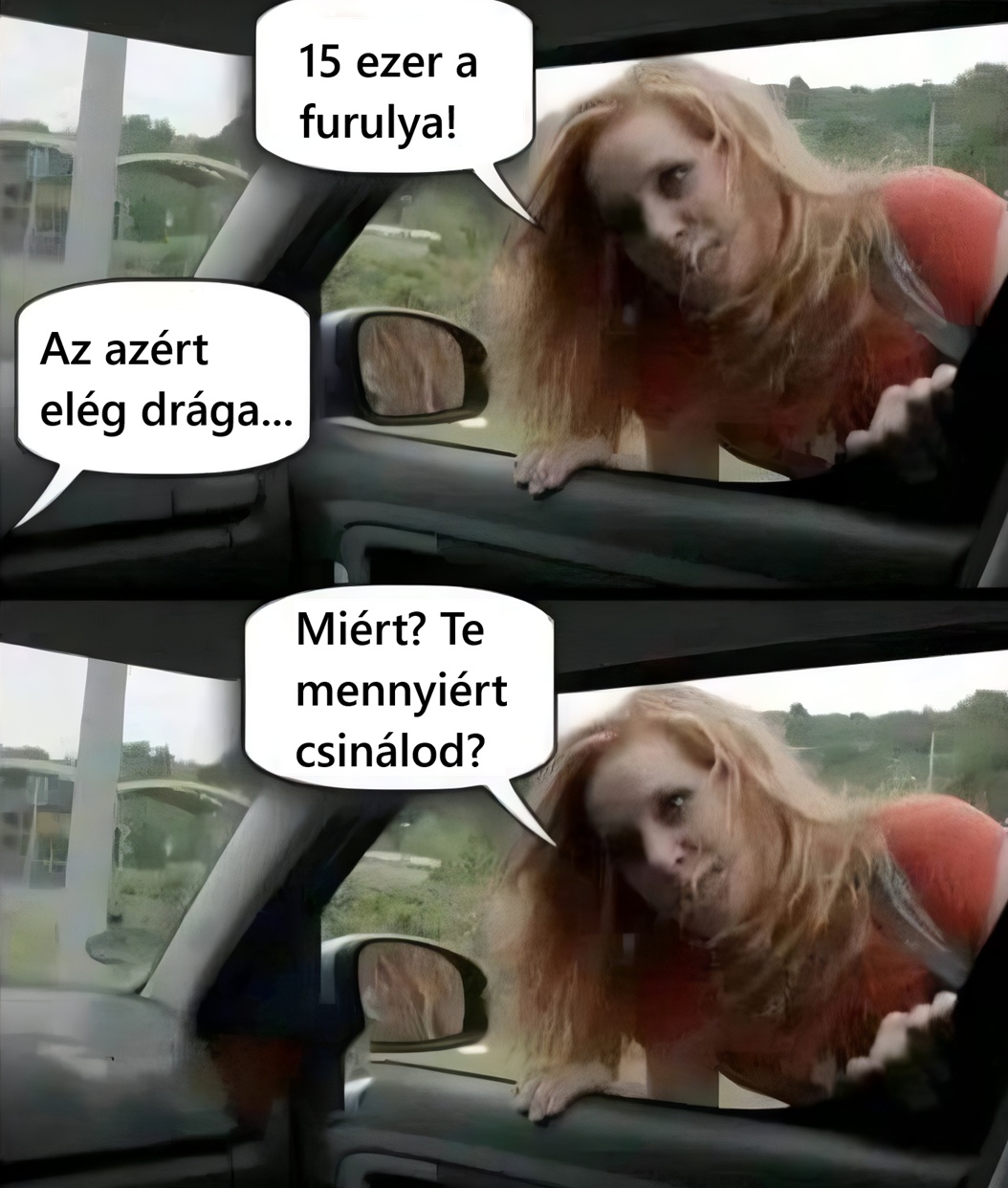 15 ezer a… Két „dolgozó” lány összetalálkozik, és pihenésképpen leülnek egy italra. Az egyik megkérdezi a másikat: – Te mennyit kerestél ma? – 20100 forintot. – Kitől kaptál 100 forintot? – Mi az hogy kitől? Hát mindenkitől!