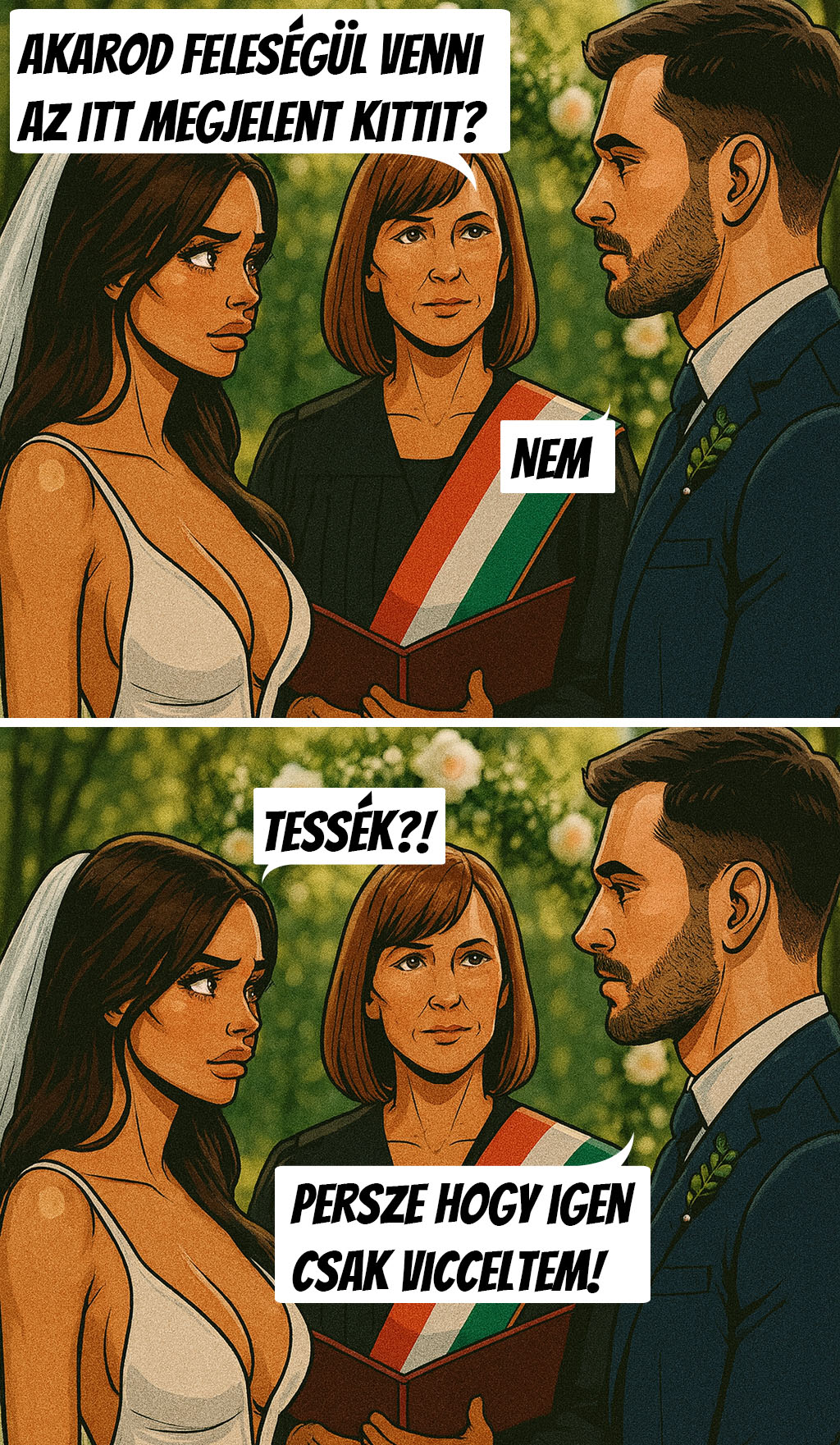 19. Amikor az anyakönyvvezető feltette a kérdést: „Akarod-e feleségül venni az itt megjelent Annát?”, a vőlegény egy kis gondolkodás után rávágta: