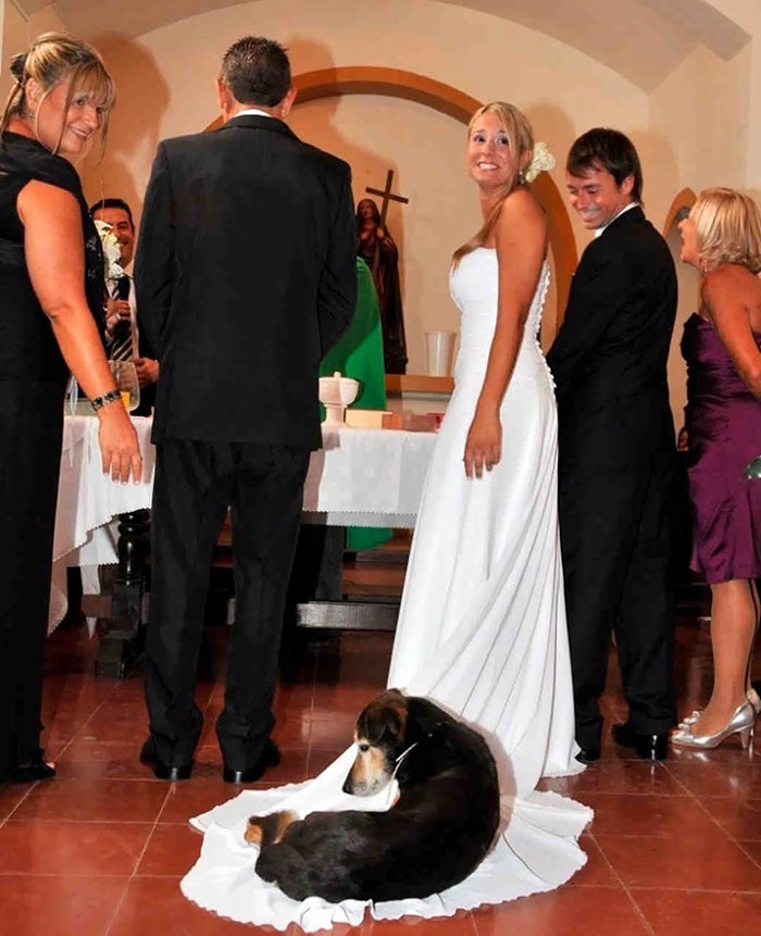 18. A kutyánk is meghívott vendég volt – egészen addig, amíg el nem döntötte, hogy a menyasszonyi ruha közepén kényelmesebben fekszik, mint a saját ágyában.
