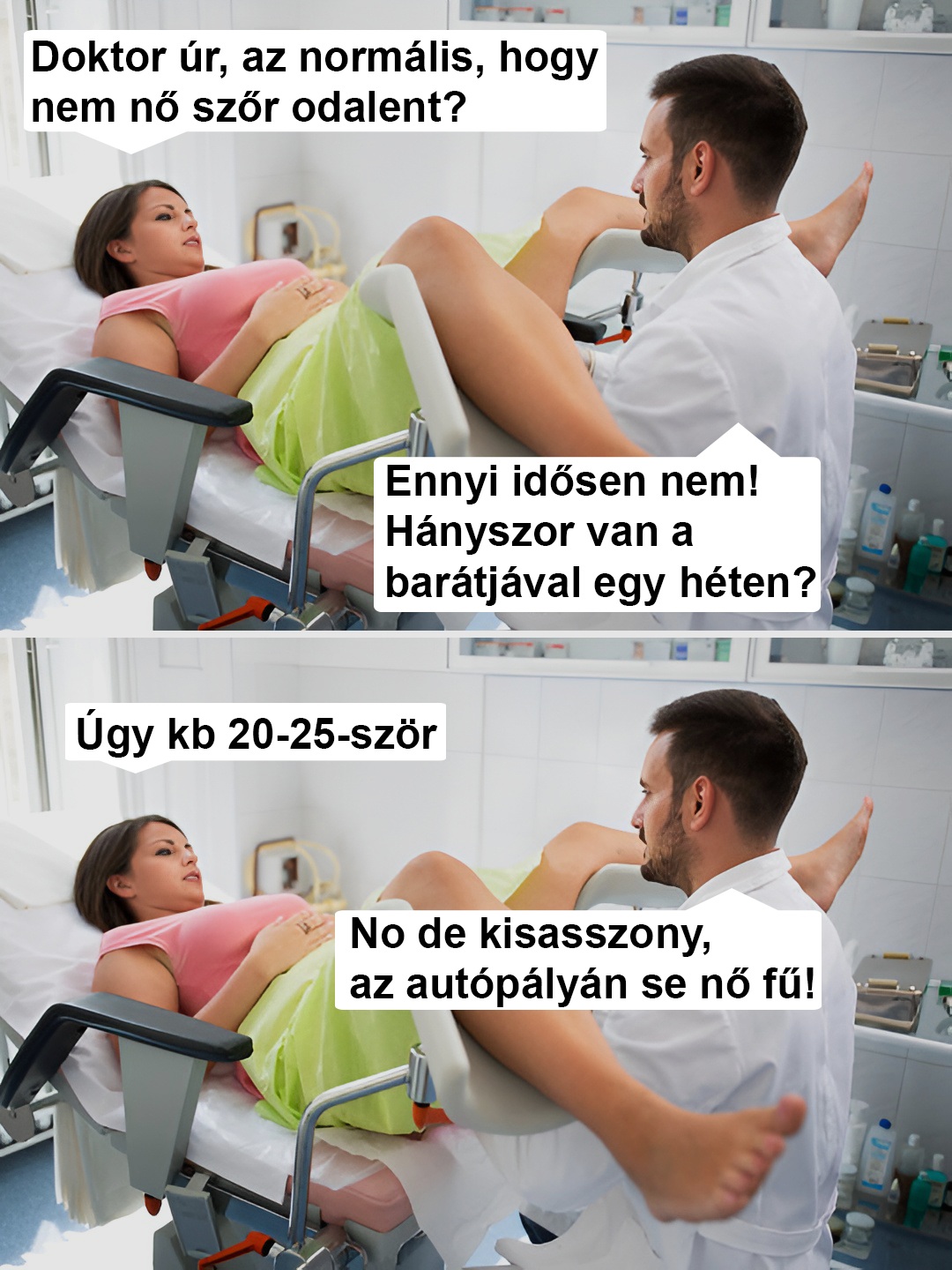 – Már néhány hónapja próbálkozunk, doktor úr, de még nem sikerült teherbe esnem. – mondja szégyellősen.
