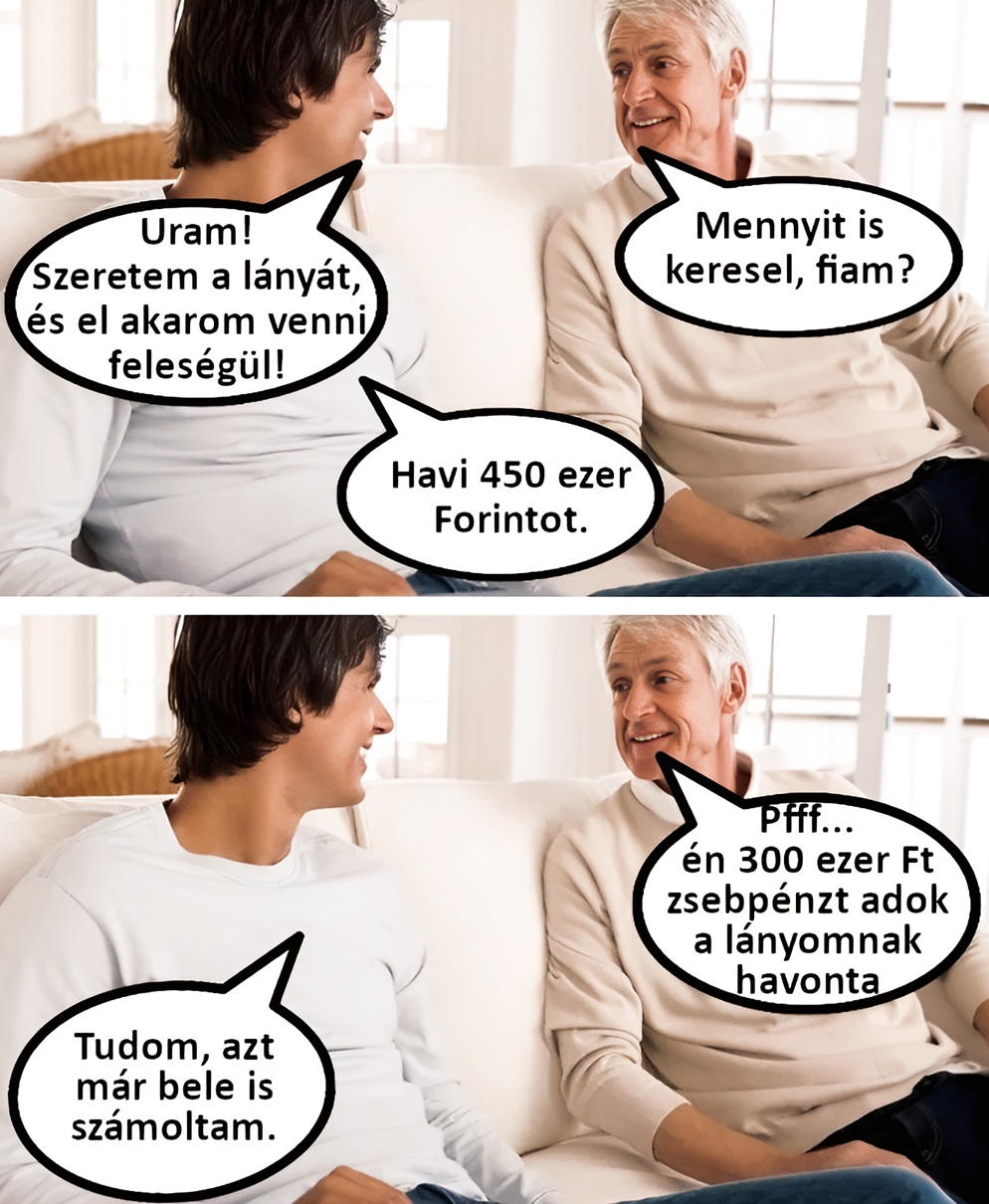 – Fiam, van annyi jövedelmed, hogy ha feleségül veszed a lányom, el tudd tartani a családot?