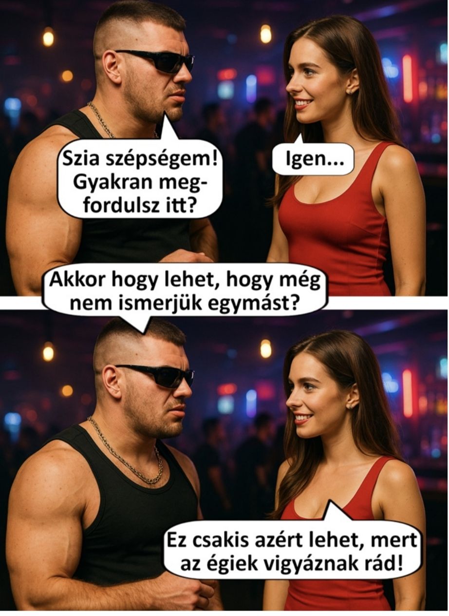 Gyakran megfordulsz itt? Ismerkedés a diszkóban: – Van autód? – Igen. – Az jó! És milyen színű? – Kék. – Az szép! És hány személyes? – Kettő. – Hűha! És hány köbcentis? – Hatezer. – Ahh… hú, az nem semmi! És milyen gyártmányú? – IFA.
