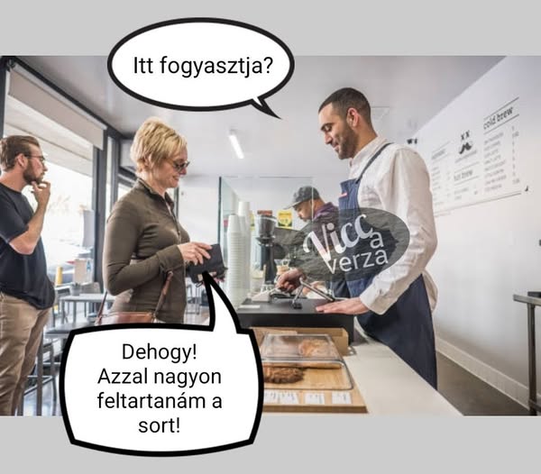 A pincér tudja a dolgát, kihoz egy finon bort az embernek. Látja ezt egy másik ember is, aki marhapörköltet evett. Tanulván az előző ember udvariasságából, ő is inni kér: