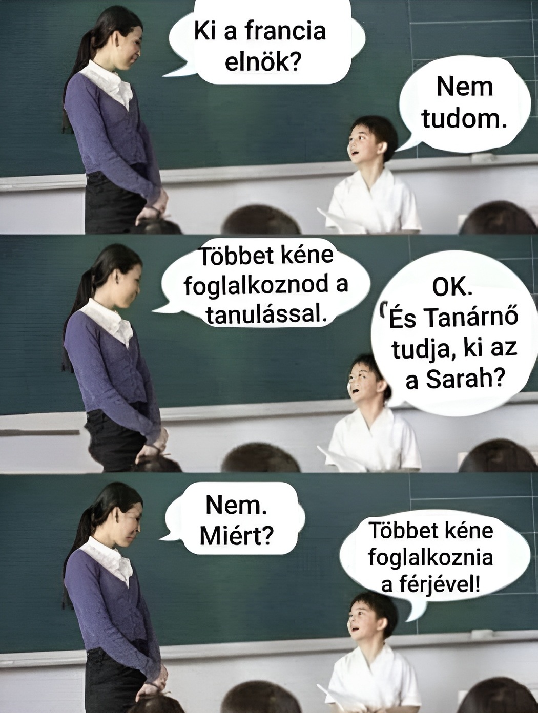 A tanító néni megemeli, és látja, hogy valami szivárog belőle. Viccesen megkóstol egy cseppet, és megkérdi: