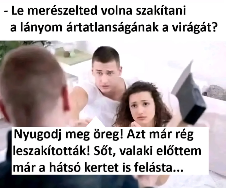 – Tudod – lihegi a vénlány – amikor betette, több volt, mint egy arasz, amikor kivette, csak egy ujjnyi volt. Itt még kell lenni egy jó darabnak!