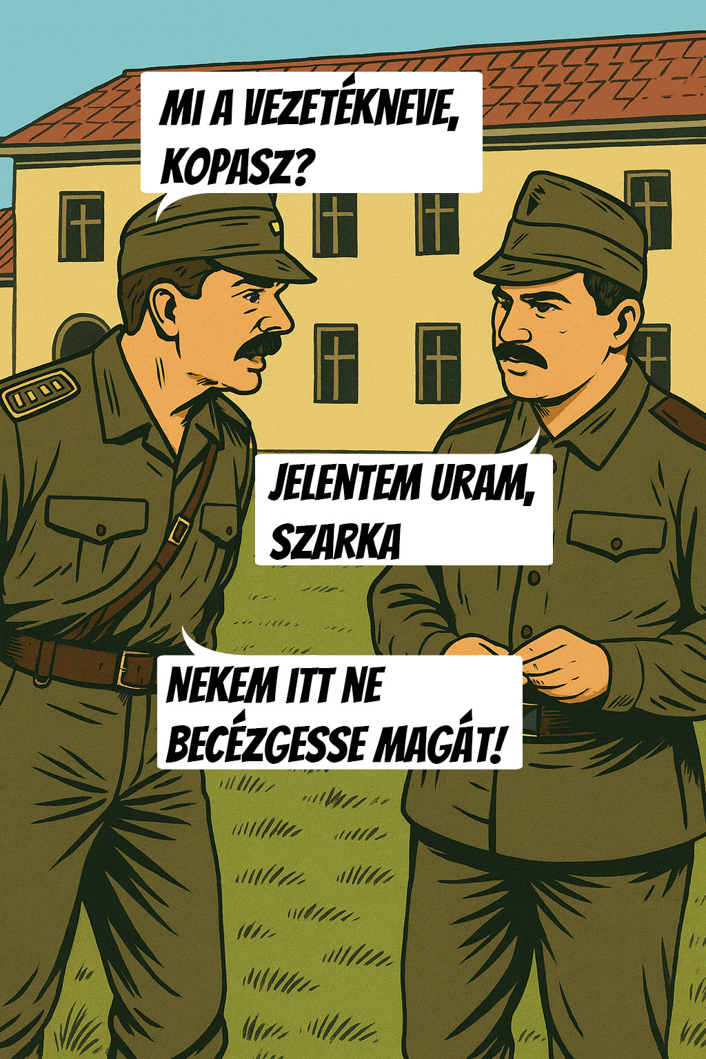 – Kovács honvéd! – ordítja az őrmester. – Kimenni az épület elé, és figyelni, mikor érkezik a tábornok!