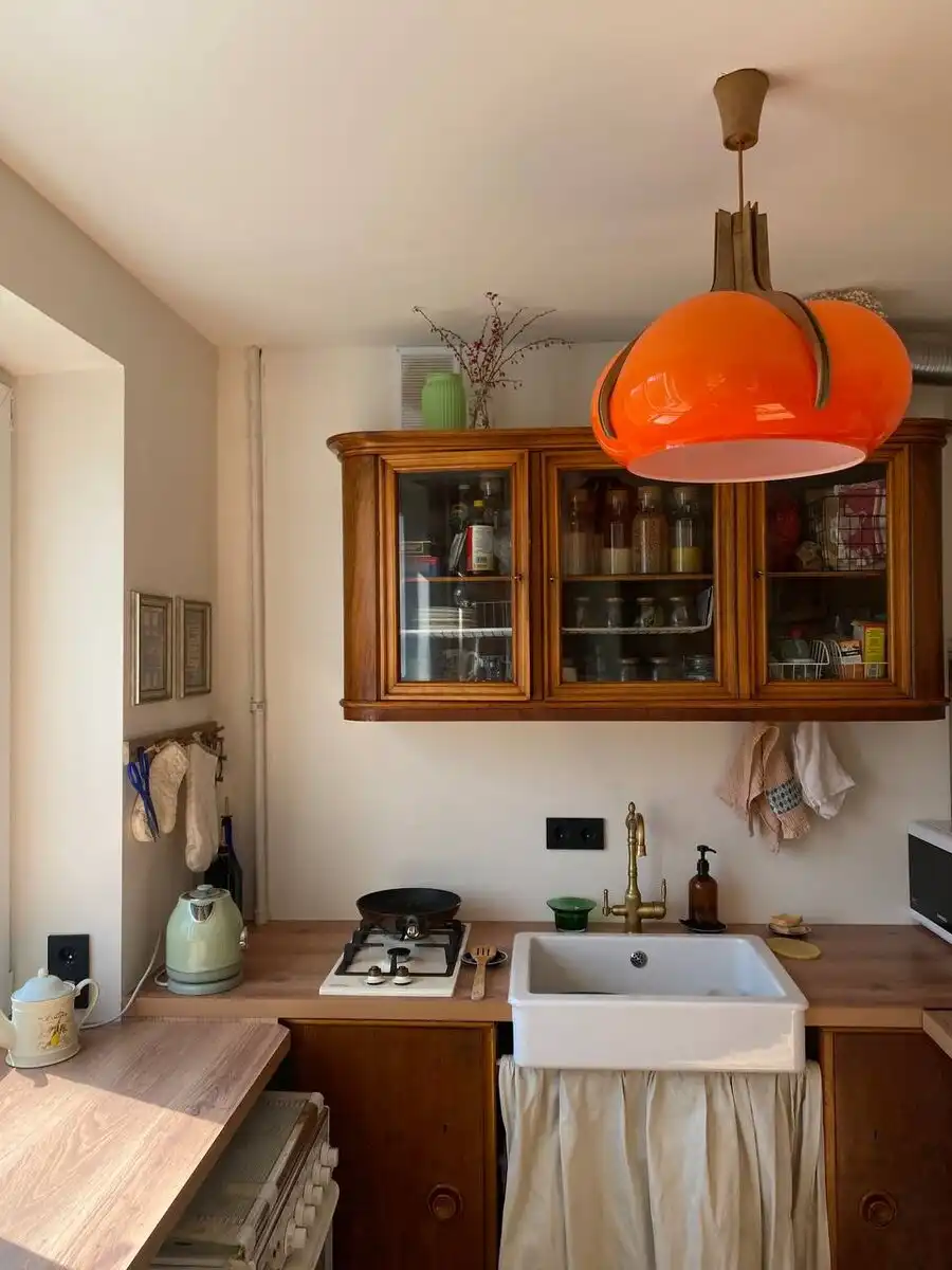 Erről a lakásról külön ismertetőt szeretnék készíteni, de egyelőre megmutatom a konyhát – ez is figyelmet érdemel. Itt nincsenek IKEA szekrények és divatos csempe. Ehelyett valami a countryhoz hasonlót találunk, a háziasszony ízléséhez és a panelház-realitásokhoz igazítva.