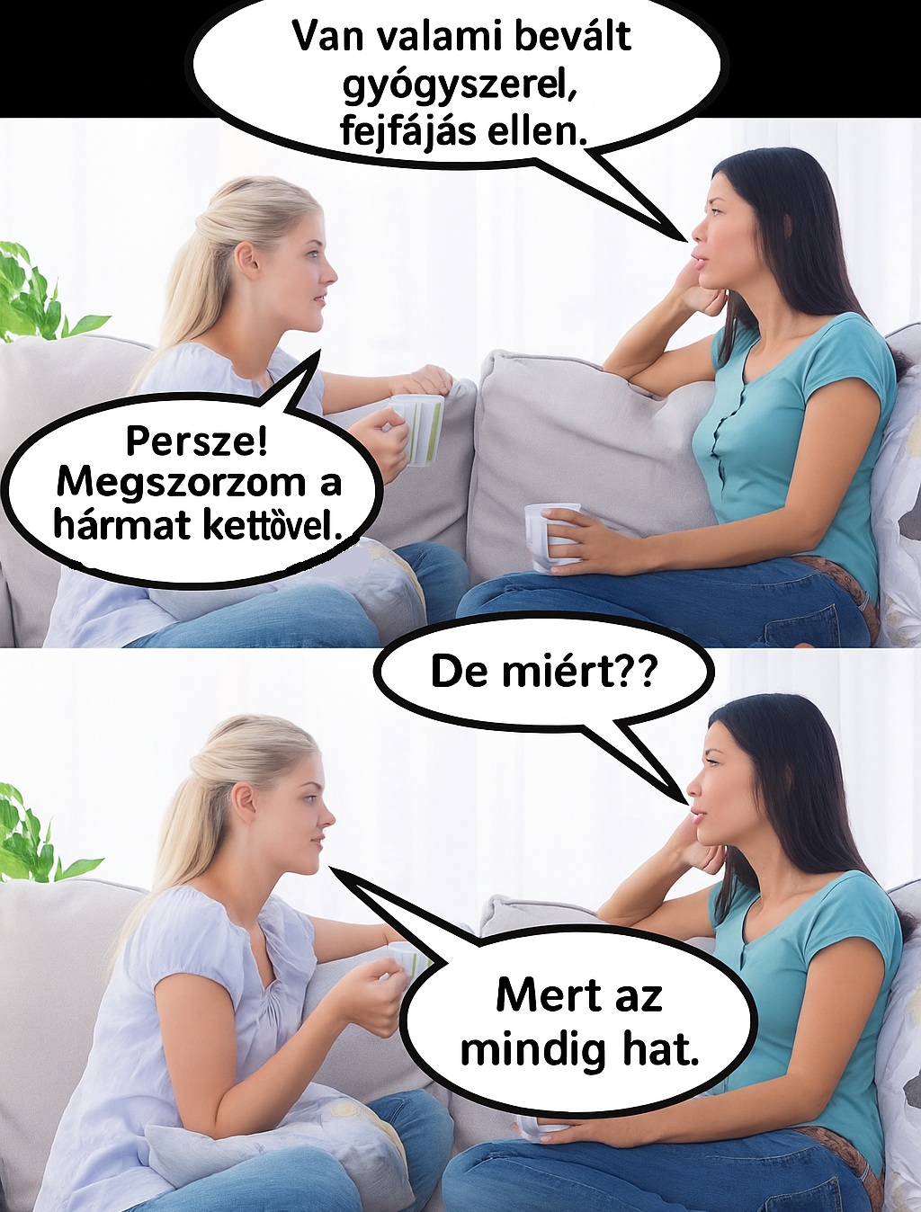 – Igen, kérem. Kitűnő kombinált gyógyszerünk van. Fejfájásra, gyomorgörcsre és hátfájása is jó!